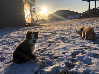 I... am.. still getting used to her. But she's cute. She can stare into your soul without blinking. Her eyes are changing from a crystal blue to more of a whiteish blue. She is a runner and likes to bolt when given the opportunity. Her instincts to herd are soooooo ingrained into her genetics that it just fascinates me to see each day, but also comes with struggles as she nips at our heels and tries to herd the kids. She howls in her pen all morning until she's had energy burned, and it's hard because most days are rainy and cold, so we struggle to get her out. On the days that are nice enough to get out we really enjoy sending the boys out to walk her; it gives them something to do and she is not a bad little walker most the time.